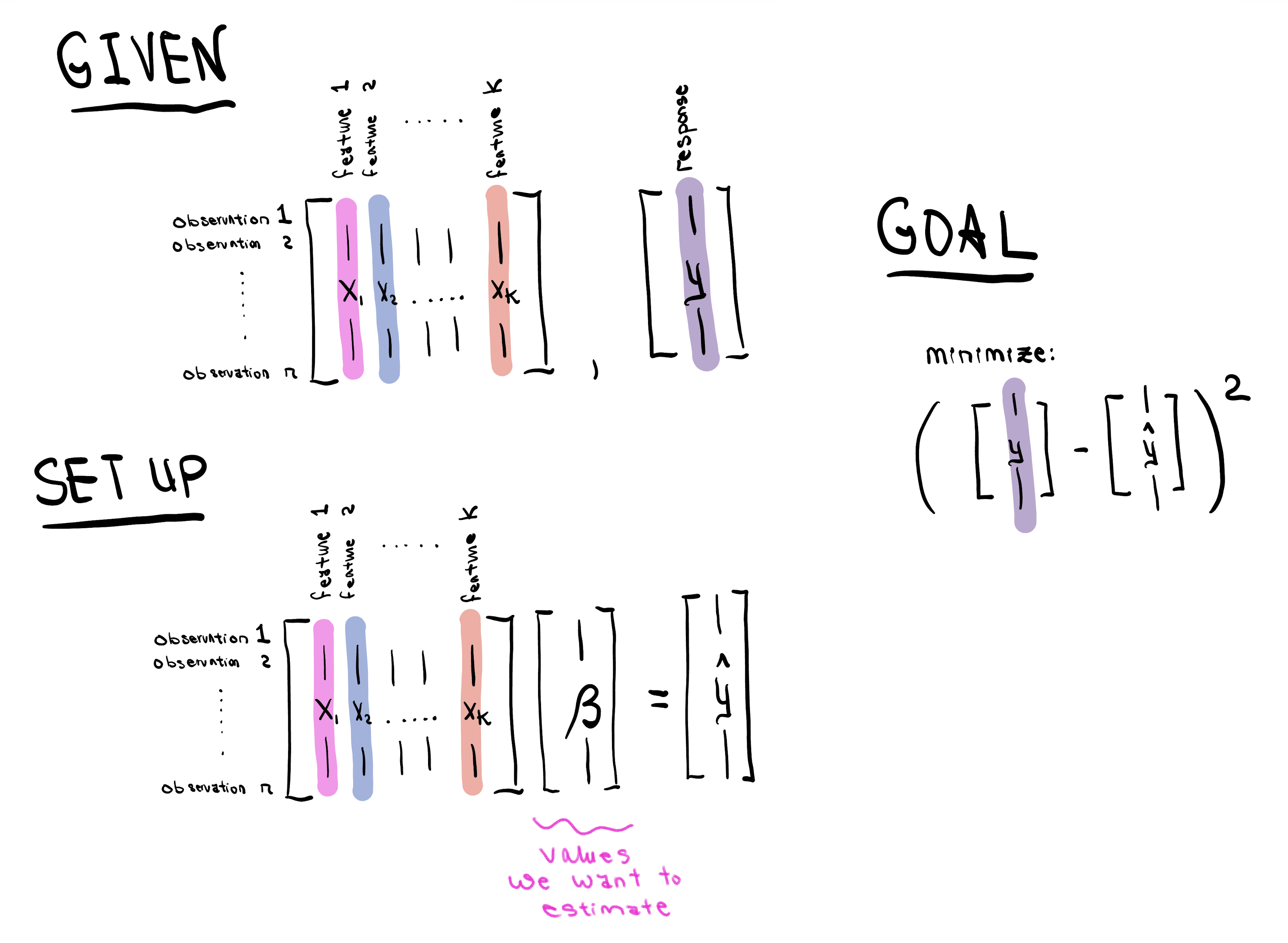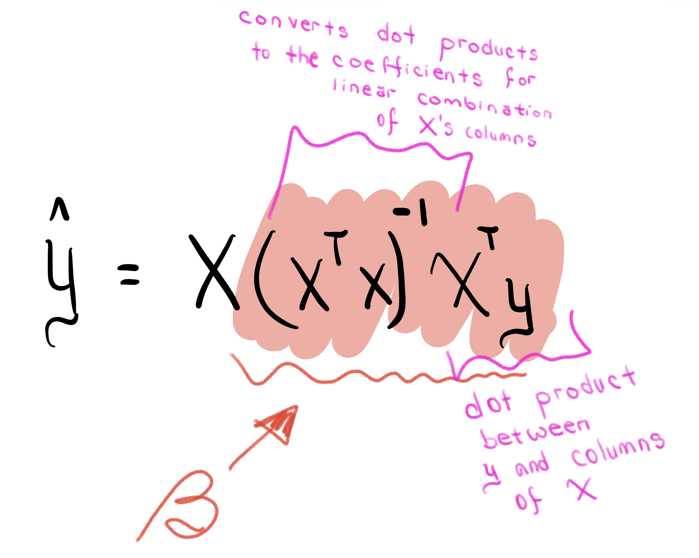\[\beta = (X^{T} X)^{-1}X^{T}y\]… a formula that feels intimidating, and seems to come from nowhere. (We could bash it out by taking the derivative of the loss function minimizing mean-squared error $(y - X \beta) ^T(y-X \beta)$, but that is not very insightful.)